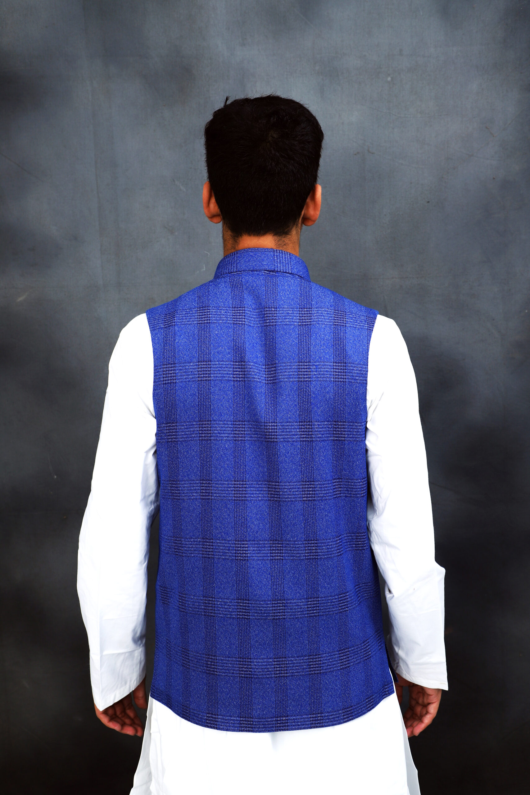 - Styling: The jacket is shown paired with a white long-sleeved kurta pajama set, which is a common and traditional way to style this garment.
