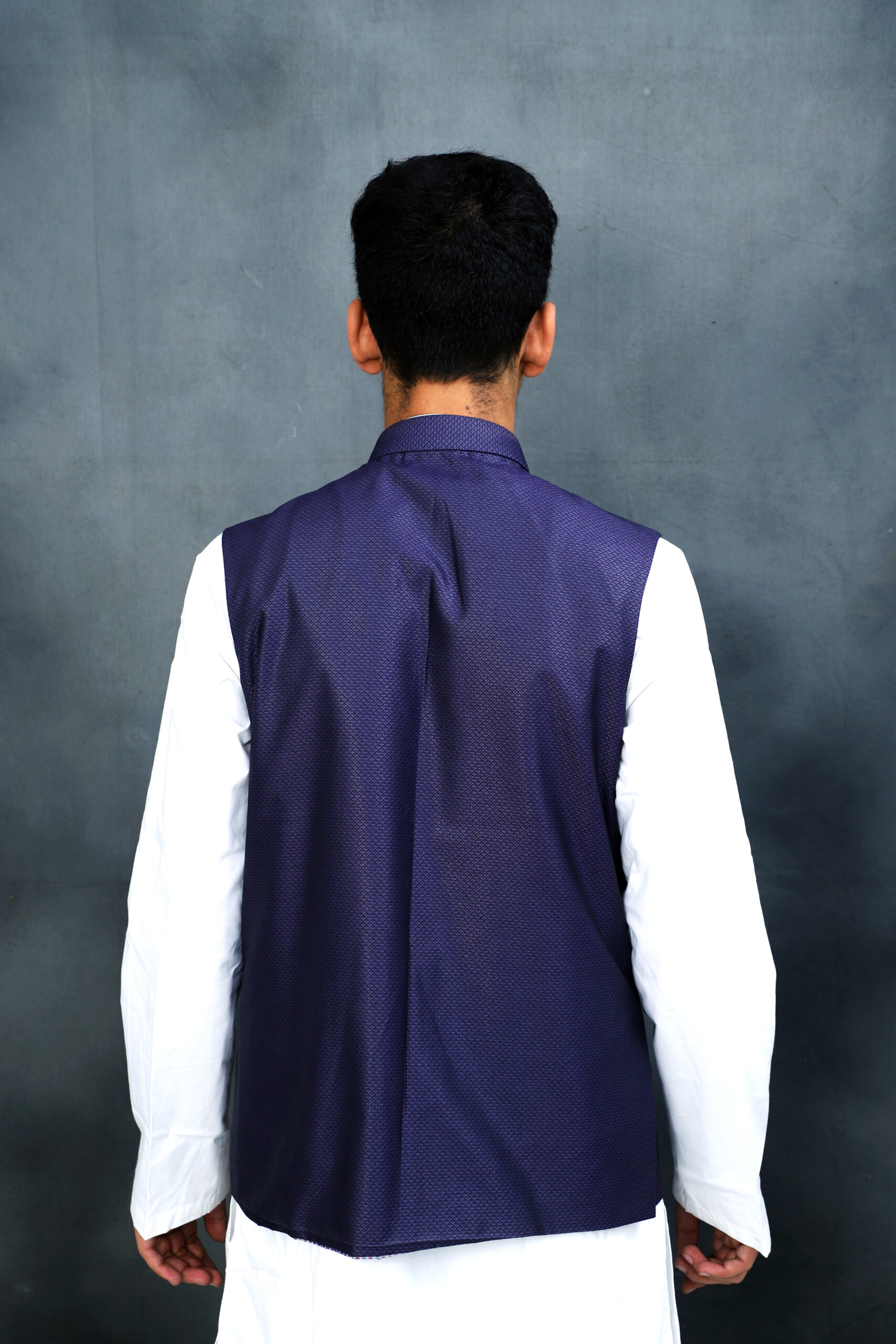 • Styling: The jacket is shown paired with a white long-sleeved kurta pajama set, creating a traditional and elegant contrast.