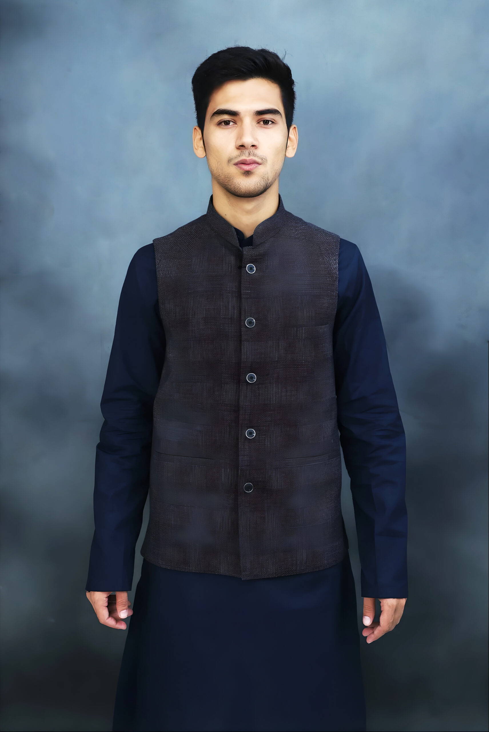 Description: A sophisticated and modern men’s Nehru jacket, also known as a Modi vest. This sleeveless waistcoat features a unique, textured weave that gives it a stylish and contemporary feel, perfect for a range of occasions from semi-formal events to casual outings.