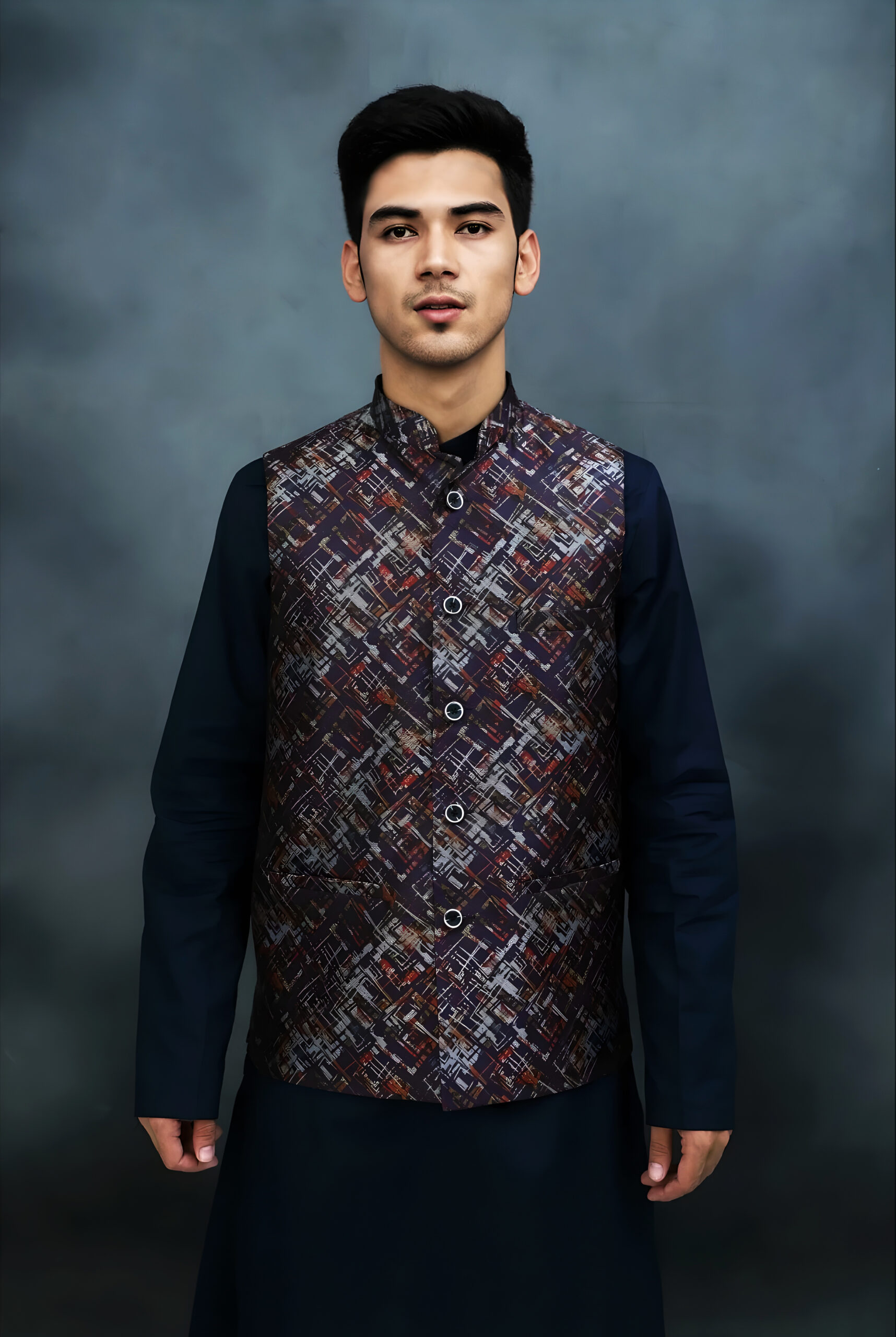 Elevate your traditional or semi-formal attire with this stylish and modern Nehru jacket. Crafted from a high-quality, textured fabric, this waistcoat features a unique, multi-color abstract print with a dynamic, crisscross pattern in shades of navy, burnt orange, and grey. The intricate design adds a contemporary flair to a classic silhouette.