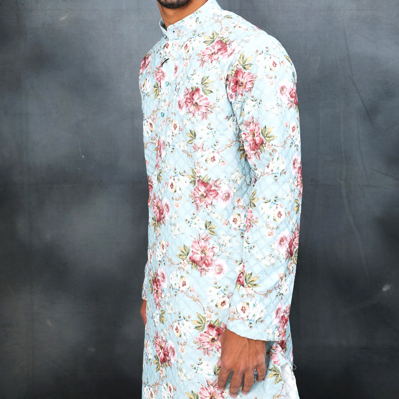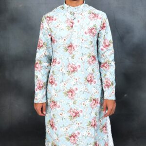 Embrace the joy of special occasions and everyday elegance with our captivating light blue floral textured kurta. This refreshing piece is designed for those who appreciate unique patterns and comfortable fashion, making it a perfect choice for Eid celebrations, family gatherings, or simply adding a touch of sophisticated cheer to your look in Deoband.