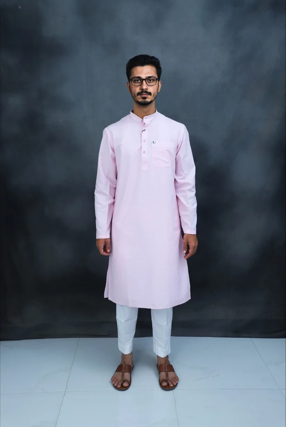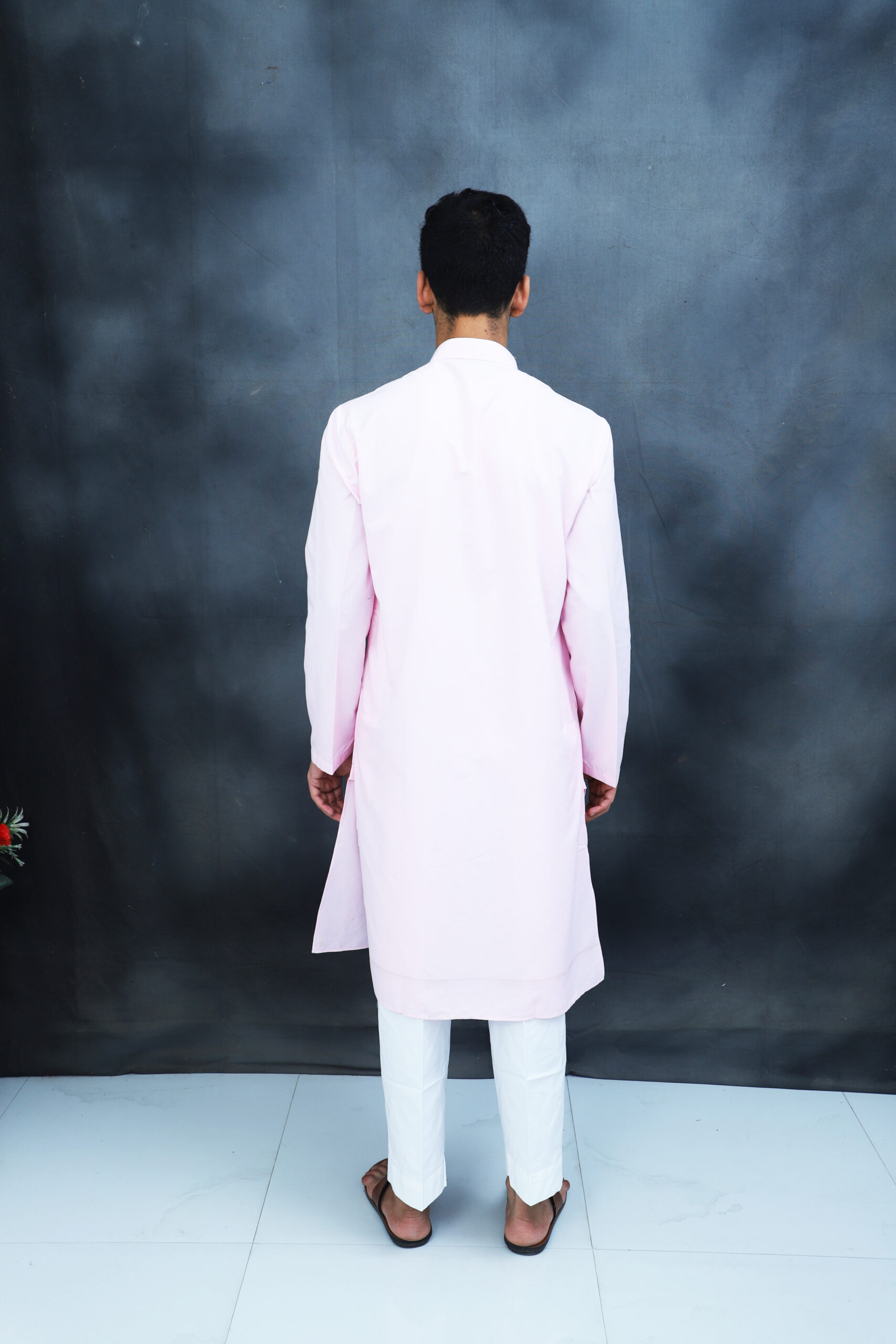 This is a classic men’s kurta set featuring a stylish pastel pink long kurta paired with crisp white pajama pants and open brown sandals.